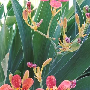 ヒオウギ(檜扇) あやめ科 多年草 厚みのある剣状の葉が何枚も重なり合い、扇を広げたように見えることから、この名前で呼ばれる。 花は1日花 庭植えや生け花材料 花後、袋状の大きなさやができ、熟すと割れて、中から黒いタネが出てきます。タネは直ぐは落ちない