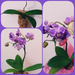 こんにちは😊母の日の見切り品で連れ帰ったマイクロ胡蝶蘭 蕾もあって、咲きった後で根っこを知らぺてバークチップに植えてみましたが、🌱新芽が出たものの育たずにバークチップから出してみたら根っこが二本腐っていました😰 黒くカビている所をチョンパして、板付に変更して見ました😓