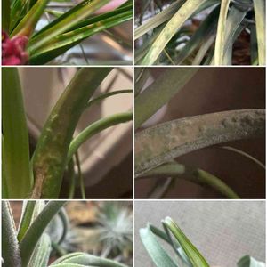 最近チランジアの調子がよくありません💦 経験値が少ないので、写真の症状に思い当たる節がある方、何でもいいのでご意見くださいますと参考になります🙇♂️ 左上と右上はエクセルタ×ベルティナ 水やりのビフォアアフターです。 真ん中の2つはカーリースリム 水やりのビフォアアフターです。 右下もカーリースリムで、真ん中の写真と同じ株です。 真ん中の写真は昨日のものですが、右下の写真は8/8のもの。 水やりしていないのに濃い部分があり、少し硬くなってました。 左下はカプトです。 8月半ばに5日ほど長期不在しましたが、それ以外は1日おきにバケツにドボンで、サーキュレーターは回しっぱです🌀 長期不在の時も微風にして回しっぱでした。