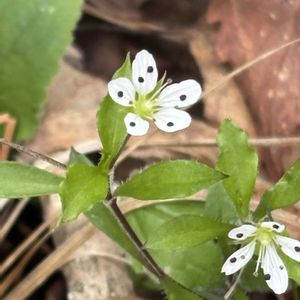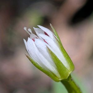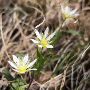 ヒゲネワチガイソウ (髯根輪違草) ナデシコ科ワチガイソウ属 ・ワチガイソウに似ているが、花弁も葉も細い ・花弁は5~7枚 ・花弁が細いために、花弁と花弁の間に隙間が出来る特徴がある (4/27)