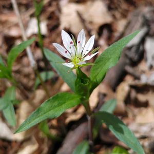 ヒゲネワチガイソウ(髭根輪違草) *ナデシコ科ワチガイソウ属 花期は4〜5月 福島県〜中部地方の山地の林内に生える多年草! 高さは10〜20cm 上部 2対の葉は接近して幅が広く、下部の葉はまばらに対生し線状へら形! 茎に1列の軟毛がある! 花は1個が茎先に付き、5〜7個の白い花弁は先が切れ込まない! ヒゲネワチガイソウの花柄は無毛で、似たワチガイソウは有毛! 私の分布域で見た事の無い初見の山野草ですが 間違いなく同定出来ているのでしょうか? もし 間違えている場合は是非教えて下さい。 4月21日撮影 栃木県矢板市
