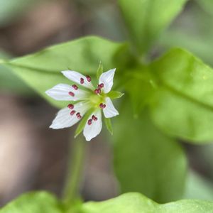 おはようございます😊 天気回復しそうです☁️▶︎☀️ Mr. マーさんの 🏷️素敵な水曜日 🏷️オシャレな粋曜日の花 さっちゃんさんの 🏷️白い水曜日♡ かねーちゃんさんの 🏷️白い貴婦人✨️ 廣花奈さんの 🏷️秘密の花園♡ しもむさんの 🏷️愛の花♡ 🏷️ありがとうの花❣️ 🏷️花咲く乙女たち♡ 🏷️純白マニア に参加させていただきます♪ その⑥ 「ヒゲネワチガイソウ🤍🔴🔴🔴🌿.∘✨️」 その花は木陰の木の下に 少しまとまって ひっそりと咲いていました✨️ 小さくて可憐です✨️ 花の径は1cmくらい 花弁が細くとがり 5〜7枚 (似ているワダソウは花弁は 丸めで先端がくぼむ 5枚) 濃い赤い葯🔴🔴🔴が アクセントになり なんとも かわいらしい😆 萼も細く線形~線状披針形で 花弁と同じ枚数 花柄は無毛(確認しませんでした😅 ワダソウは有毛) マクロレンズで撮ったけど(3枚目) よく撮れませんでした💦 雄蕊は10-14個 花柱は2-3個 ナデシコ科 分布 福島県〜中部地方 山地の林縁 や林下 それではみなさん♪♪ 今日もステキな1日を お過ごしください🍀*゜✨ ✩*⋆°ෆ*⋆°ஐ*⋆°✩*⋆°ෆ*⋆°ஐ*⋆°✩