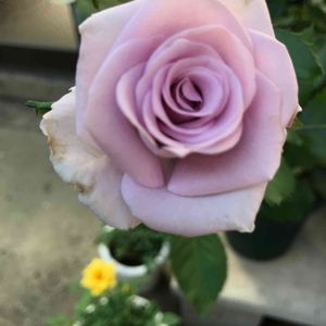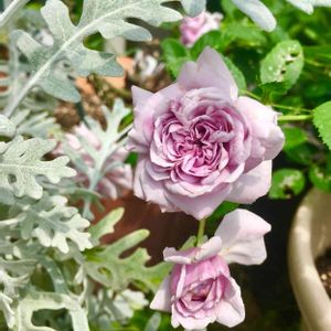 今朝の薔薇🌹🌹🌹 カインダーブルーさん。 暑さのせいか花弁も元気無い朝と晩に2回水やりが、必要です。毎日ほぼカラカラになってます。今年は、春前に鉢替えした時にかなり大きな幼虫が、居たので心配してたがこの暑さで、更にバテバテになっているかな?