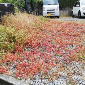 ついでに、と言ったらこの花に怒られますが、何の花でしょうか、向かいの駐車場の縁が真っ赤に紅葉?して来ました。