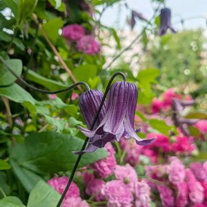2025年5月27日(火) おととし買うた、見切品の品種不明のクレマチス去年は咲かず、今年やっと咲いてくれましたー♪ かわいい色の プリンセスダイアナでしょうか?