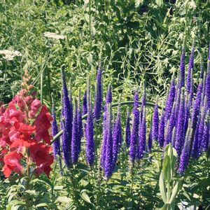 日が差してきたのでパチリ。 一枚目、赤の金魚草とベロニカ 二枚目、黄色と白の金魚草と黄色のガザニアが少し、背景左にニゲラ、右奥にゴテチア