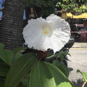 真っ白な花がラッパみたいな形で咲いてます〜🎺