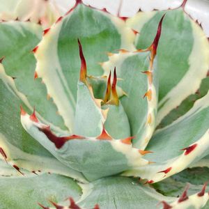 トゲトゲへのときめきˆˆᵃⁿᵈ Variegataへの蕩めき(*´`) こんにちは(^^) 良いお天気☀ 仕事何て(><)))(((><)イヤイヤ 比較的大きなアガベさんは、 目線の高い所に置いているので 格好良い姿は見れても 成長点近くの綺麗な部分があまり見えない💦 上からカメラでパシャリしてよく楽しんでおります(*´`) の、吉祥冠錦さんˆˆ Agave potatorum ‘Kisshoukan’ f. varieg 新葉は、スーパークラウン並に綺麗かぁ(*´`)