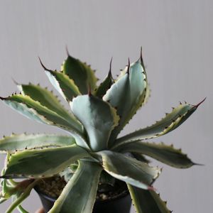アガベ 吉祥冠 錦•*¨*•.¸¸♬︎ 2年前の秋にお迎えした子です☺️ 軒下管理でたまーに水やり するくらいでも元気に育ってます🙌 ずいぶん大きくなってしっかりしてきました☺️ 子株もできてるけど 外そうと挑戦してますがトゲが痛くて難しいです😭 無理に引っ張って葉っぱがちぎれてしまって😂 何か良い方法があるのかなー?