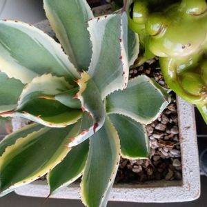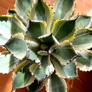 こんにちは🌿 アガベ・吉祥冠錦です ちょっと開き気味ですが、元気です。 いまの鉢は水持ちが良すぎて多肉は合わないかも 春になったら水はけの良い鉢に植え替えます🙂 今日もよろしくお願いします☕
