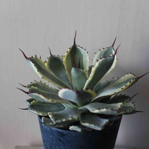 植物名:アガベ 吉祥冠 科名:リュウゼツラン科 属名:アガベ属 原産:メキシコ、アメリカ南西部 [サイズ] 全体の高さ:32.0cm 全体の幅 :23.0cm 鉢の高さ :18.0cm 鉢の横幅 :22.0cm 皿の直径 :19.5cm 皿の素材 :アイアン(防サビ加工) [育て方] 日当たり:日向 水やり :土が乾いてから数日後に底穴から水が抜けるくらいたっぷりと。受け皿に水はためないように。冬場は1ヶ月に1回または断水。凍結させないよう要注意。 ※環境によってタイミングは変わります。 置き場所:日当たりが良く、風通しの良い明るい室内または屋外 耐寒温度:5℃ 赤い棘のある、ロゼット状の葉が印象的な、アガベ 吉祥冠の中でも、 透明感のある緑の葉に黄色い斑が綺麗に入った斑入りの吉祥冠です。 真上から覗き込むと、緑、黄色、赤の美しいコントラストが楽しめます。 日当たりを好むため、日光の当たる場所に置いて管理してください。 存在感のある葉を引き立たせるため、 マットな黒POTにコーディネートしました。