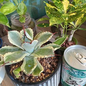 アガベ6種類目お迎え記念撮影📷 吉祥冠錦🪴 昨日ホームセンターで笹の雪、五色万代とならんで売られていた😲同じくらいのサイズで値段も同じ🪴笑笑 どれも欲しいけど、前から欲しかった君に決めた✨ 赤い棘と斑入りの葉っぱが綺麗✨ アガベは丈夫だけど、かっこ良く育てるのは難しい でも趣味やから😙楽しい 不思議とずっと眺めていられる🪴 なんでだろう🤔