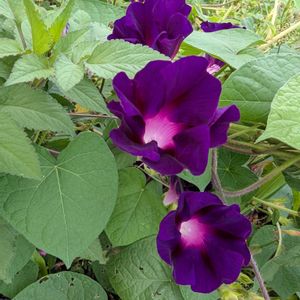 🍀アサガオ 🏷️今日のお花 ヒルガオ科 ①②大輪アサガオ ③マルバアサガオ 前日の日の入りから約9時間後に開花するそうです🌸☀️ 時間を見て開花するお花 多いですね🤭 散歩道にて 去年の写真です