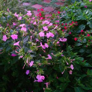 ピンクと赤のオシロイバナ、宝石箱をひっくり返したみたい🤗。 秋の気配の裏庭にて。