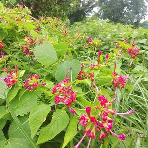 今朝の散歩道。 水元公園、遊歩道に オシロイバナが咲いていました。