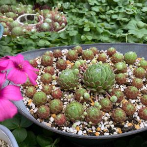 センペルビウム ラウンドシーン 小さなアンテナがぴょこぴょこ出てたお迎え時でしたが、反日陰でほぼ雨ざらしでそれぞれ大きくなり整理して今はぎゅーぎゅー。もう1鉢とあちこちに寄せ植えにいます。