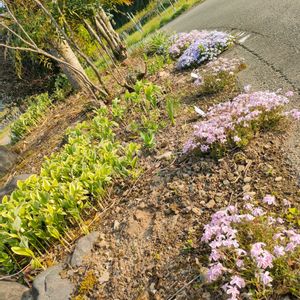 🏷毎月28日はグランドカバーの日 かぷりんさん参加しま〜す👋 芝桜 ヒメイワダレソウ ピンクネコヤナギ (*˘︶˘*).。*♡ 1枚目 西日がガンガンあたるこの場所に何気なく植えた芝桜が以外と育つとわかったので前の休みに生協で買ったピンク以外の苗3株植えました(◍•ᴗ•◍)❤ 上手くいったら緑のまとめ更新します😏 2枚目 ピンクネコヤナギの後ろにはヒメイワダレソウが広がってます。だだっ広い敷地にはとても便利です🤗