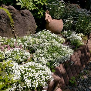 【1枚目】余ったスイートアリッサムを植えておいたらこんなに可愛らしいコーナーになりました😆💕 9月22日播種から220日目/7ヶ月と8日目。 株もお花もひときわ大きい白花は4倍体のスノー系のアリッサムです。自家採種でも半分くらいは4倍体が咲きます。先祖返ったとしても2倍体の小さなタイプの白花が咲くだけなので、自家採種はアリだと思います👍 奥の方はこれまた余ったクリサンセマム・スノーランドを。ノースポールもまとめて咲くとなかなか見応えがありますね☺️ こちらは9月12日播種から230日目/7ヶ月と18日目。 【2枚目】冬からの様子を並べてみました。植え付けは1月くらいだったかと。最終的には繋がりましたが、2倍体の小さなアリッサムだけだったらもっと詰めて植えた方が良さそうです。 ただ余ったから植えただけですが、一年草のグランドカバーと見なしても良さそうです。昨日今日で隙間にカタバミが目立ってきましたが、本日取り除いたところ隙間だけに生えてきているようなので、日光を遮断するタイプの雑草対策にはなっているみたい😆👍 【3枚目】今回咲いたお色を記録。色の濃淡はあれどこんなもんかな。 レモン色は単体だと白花に見えるので、4倍体の白花アリッサムと並べてみました。比べてみると4倍体のお花はほんとに大きいですね😳 4倍体のアリッサムは春にモッコモコになるのでイチオシでしたが、お花や株は小さいけどカラフルなアリッサムも可愛いくて気に入りました🥰 また種採りして来季も蒔こうと思います!💪 【4枚目】こんなふうに咲きガラを採っておいて乾燥させた後、指でモミモミすると種が採れます。どれが種だかわからなければ乾燥させた咲きガラのまま保管し、秋に蒔き床の上でモミモミしてバラまけば芽が出ると思います。3日目くらいから発芽してくるのでわかりやすいですよ☺️ 【5枚目】こちらはストックの根元に植えたものですが、4倍体の白花は現在こんなにモッコモコでーす😍 左画像は定植時の画像で、こんな小さかったんですよ😳 60cmプランターに4株でちょうど良かったです。 スイートアリッサムの種まきはとても簡単なので、ぜひチャレンジしてみてください。種も売っていますし、自家採種も良いと思います。 うちも来季はもっとアリッサムだらけにしたいと思います🥰💕
