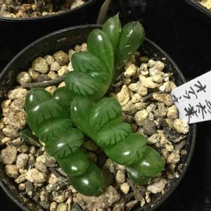 こちらはお気に入り、黒太葉オブツーサさんの葉挿しっ子です♪( ´▽`) 今まで葉っぱが一直線でしたが、ねじれてきました☺️ いよいよ形がオブツーサっぽくなってきますね(`・ω・´)