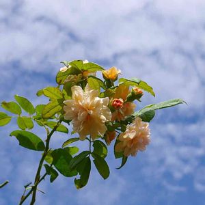 昨日の雨で満開の薔薇 バフビューティーが かなり散りました😆 五月晴れに飛行機✈️雲☁️🎶