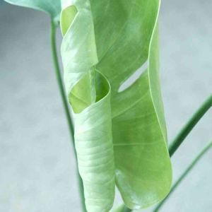 水耕栽培していたモンステラの葉が開きました🍀 小さい(手のひらサイズ)のに左右に切れ込みが入ってます。 でも少しだけ葉っぱにキズが有るのが残念です😩