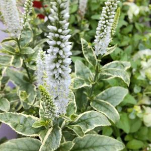 宿根ベロニカシャーロッテ 開花時期は初夏~秋、直立で高さ約90cm × 幅は約50cmまで成長します。葉色は緑色でふち部分に白色の覆輪が入り、葉身は披針形でふち部分に鋸葉があり、葉序は対生葉序に付きます。 【育て方】 日光のよく当たる場所で最もよく成長して沢山の花を咲かせます。日当たりの悪い場所では開花が悪くなったり細く弱々しい茎が徒長して倒伏しやすくなったりするため、基本的には直射日光が6時間以上当たる日向で育てましょう。 土壌の土質 良好な水捌けがない場合、根腐れを引き起こし生育不良になる可能性があります。そのため粘土質な土壌は避け、通気性と保水性が良く、有機物もしっかり入った肥沃な壌土で育てましょう。