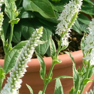 昨年だったか、地植えしたら大きくなり過ぎて処分したベロニカ💦 もう絶対いらないと思ってましたが、風に揺れるふわふわした白い花、斑入の葉がなんとも涼しげ🌿 前回は濃いピンクでちょっと暑苦しかっただけ。白なら大丈夫かなぁと言い訳しつつ、鉢植えで育てる事前提にお迎えしました🪴
