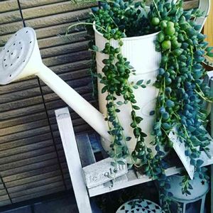 ブリキ製のジョウロの底に穴をあけてピーチネックレスを植えたのですが、伸びすぎて凄いことになってる😂