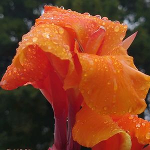 こんにちは✋ 雨粒の付いた🩵 カンナ🧡 雨の合間を見て 行ってきました 空には雨雲が 広がっていますが カンナの周りは 明るく感じました🤗 雨粒の付いたカンナ 綺麗です✨️ ✾3枚目 ツブツブの雨粒を弾く 斑入り葉っぱ🌿💚 10月16日🚶♀️で 撮影しました☺️📱✨️