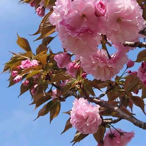 こんにちは😊✋ 今日の昼下がり ウォーキング🚶♀️で 出会ったお花🌼 サトザクラ🌸🩷 少しずつ 咲き始めました🤗 コロンとした 優しいピンク色の サトザクラ🌸 可愛いです🩷 今日は天気も良く 青空とさくらの色💙🩷 似合ってますね🤗