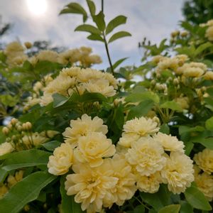 こんにちは😊✋ モッコウバラ🟡 柔らかな黄色で モリモリと 咲いていました✨ この日は 少し黄砂が飛んでいて 霞んだ空に 太陽が顔を のぞかせていました😊 ウォーキング🚶♀️で 撮影しました🤗📱✨ 4月20日🌿💚