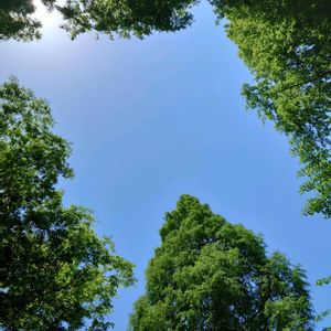 こんにちは😊✋ ウォーキング中🚶♀️ 木々の間の🌳🌲 空を見上げました😀 🩵💙五月晴れの空💙🩵 木々の緑が爽やかで きれいです✨️ 手前の木は メタセコイア🌳です🤗 5月8日昼前に☺️ 撮影しました📱✨️