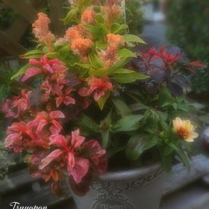 連投失礼します(⋆ᵕᴗᵕ⋆).+*ペコ 寄せ植えに使用しているアルテルナンテラが、気温の低下とともにいい感じに色づいてきました♡(⑉︎• •⑉︎)♡ᔆᵘᵗᵉᵏⁱ♡ ①寄せ植え全体像🌷.* ②アルテルナンテラ・ファニードレス🌿 ③アルテルナンテラ・カメレオン🌿 ④セロシア・ジュラサーモン🌼