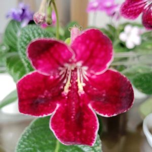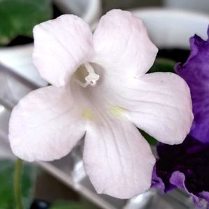 ストレプトカーパス実生苗 中心矢羽根模様3種 偶々ポットに移植時、根元の小さな芽を一緒に取り込んだ 親が同じ3種と思われ、仲良しで 咲いてます 白の紫のは入り方と花弁の質感にウットリです 白だけの植え込みも素敵になるだろうな〜と思います 🏷️春爛漫の青い花2025