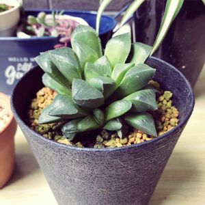 多肉植物 「ハオルチア シンビフォルミス」 何者だ‼️ の熊童子を買った時のプレゼント🎁で来た抜き苗を植え付けました。(2個前のPicです) これもあっているのかな?🤔