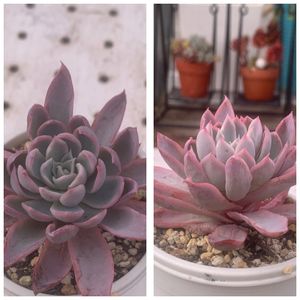 「すみれ牡丹」エケベリア属 「バイオレットクィーン」と同じといわれています 1週間ぶりに2Fのベランダの多肉さんに 会いにいきました 子もついて、葉も伸びていました 順調に育っていました😆🎶