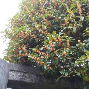 歯医者の帰り。小さな祠の石の鳥居の両脇に満開の金木犀