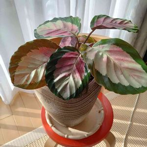 カラテア・ロージー。 鮮やかななピンク色の斑に惹かれて、お迎えしました💖 お店にあった時には、一枚葉っぱが枯れていたのですが、あれから、一ヶ月が経ち、元気を取り戻してくれました😊 カーテン越しの明るい場所が特等席です💓