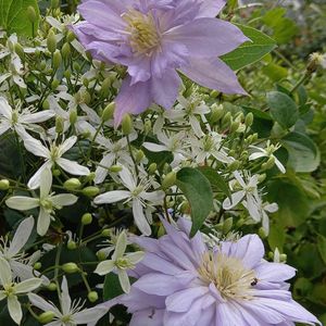 クレマチスセンニンソウと ベルオブウォーキング センニンソウは7月に満開になるはずだったのに、気づけば葉っぱも蕾も無くなってた😣キイロハバチというセンニンソウに寄生するハバチに卵産み付けられて幼虫にみんな食べられてたぁ😭 狂ったようにアー○ジェット振りまいて、一ヶ月半、ようやく満開を迎えそうです😊