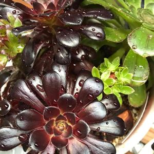 2017-6/8 ☁️ 19℃ (*´∀`*)ノオハヨウ🎶 ☔️よぉ〜さん降った(´θ`)ノ 黒法師一族サン☔️ずぶ濡れd(^_^o) 休眠期に入る合図? これが新芽キュッとなってるって事なんだろーか⁈ 休眠期の置き場所は⁈水遣りは⁈ワカラナイ🌀 ❤︎ サンバ-スト ❤︎ サンシモンカナリエンス ❤︎ ❤︎ アエオニウム 寄せ植え一族 ❤︎ ❤︎ 黒法師 ❤︎ まだら黒法師❤︎
