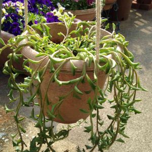 こんにちは〜( ◠‿◠ ) 今日はいい天気で午後、ベランダ仕事、、ドルフィンネックレスが伸びたので、麻ひもで鉢を吊るして見ました☺️