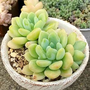 GWに原澤園芸で買った多肉をまとめて詰め込んだ寄せ植え。 季節柄グリーングリーンしてますがこれはこれでよいと思っています。 クラバツムもロッティも春萌に似た系統なんですか。 春萌成長早すぎて増えすぎるんだよなあ。 この子らもそうなるんですかね。