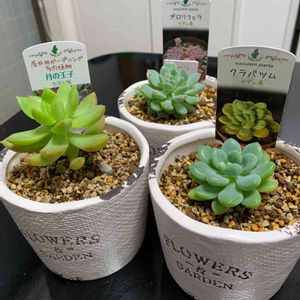 *教えていただけました!ありがとうございます🙏 先日寄せ植えで購入した多肉ちゃん達。奥の2つと手前のお花付きの多肉の名前を聞き忘れてしまったので、分かる方教えて下さい😌🙏
