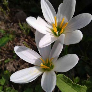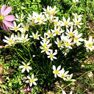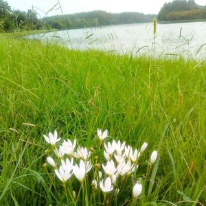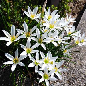 タマスダレ(玉簾) 彼岸花科 ゼフィランサス属(タマスダレ属) ⚪️良く分球して増え、半野生化している。 ⚪️日当たりを好むが、日当たり悪く肥料が少なくても育つ。 ⚪️球根が密になると花付きが悪くなる。 ⚪️別名 レインリリー まとまった雨の後一斉に花を咲を咲かせることから。 ⚪️純白の宝石のような花を「玉」葉が集まっている様子を「簾」に見立てて名付けられた。 ⚪️花言葉 「純白な愛」「期待」 ⚪️全草に毒性があり、誤食を避けるため葉や球根に似た野菜(ニラ、らっきょう、ノビル等)の近くには植えない方が良い。 お散歩の途中で見かけるお花。 暫く降っていた雨の後だからでしょうか?沢山のお花が輝くように咲いていました。