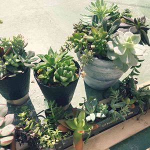 慌てて寄せ植えしたシリーズです(´∀`) 寄せ植えのために集めていた多肉ちゃんたちを、とりあえず4つ分に…😁✨✨ テラコッタの鉢は自分で塗り塗り🖌 黒っぽい容器2つのは、メルカリでポチったコたちが入ってます😆キレイなハオルチア4種と、ルペストリスの抜き苗が届きました💕 手前に置いてる細長いブリキの容器にもイロイロ入ってますが… 元々はコレに寄せ植えしたくて、ちょっとずつ好きな多肉を集めてたのに、植えたあと粉塵被害を恐れて室内に置いていたせいか…多肉が傷んでしまって😢 浅い容器だったので、ネルソルをお家ではじめて使ってみたけど、どうもゆるかったみたいです…😭コレも傷んだ原因かな…と💧 とりあえず、ヤバイの取り除いて、工事中のつかの間の日光浴中です…☀️ ネルソルから引き抜いて植え直せるのでしょうか?😰