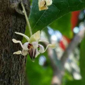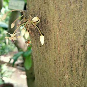 この小さなお花にカカオの実が なるのです💕大きな木の割には小さなお花 枝だでも御木にでもお花が咲く所に 実をつけて20センチ位の実を重そうに つけています。 実を見ていると小さい白い花見逃してしまいそうです💦