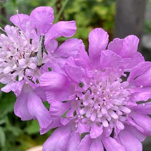 スカビオサ (西洋マツムシソウ) (マツムシソウ科) 外側の花弁は放射線状に広がり、中心部は小さな小花が集まったユニークな姿。私との共通点は、高温多湿に弱いところ😆