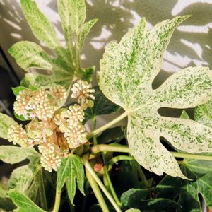『ヤツデ紬絞りの初開花』 📷玄関ポーチ🌿にて☺ 小さな苗をお迎えして8年目で初めて花茎が生えてきて花芽がつきました👀! 斑入りヤツデの成長は、とぉ~ってもユックリです(*,,•ᴗ•,,)🍊