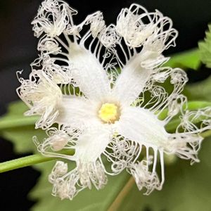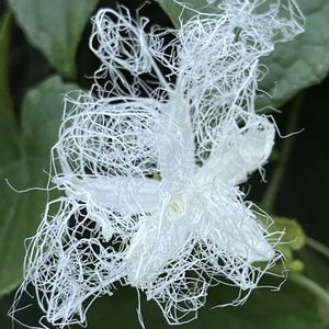 カラスウリの花に似た 白いレース状の花(径3~5cm) 花は5つに裂け 裂片の縁が 糸状に裂ける花姿をしています。 昼間に開花する一日花(朝6時) 蛇瓜🐍(へびうり)の花 ウリ科 畑の野菜