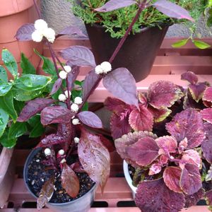 アカバセンニチコウとコリウス アカバセンニチコウは去年も一つ飾って、緑の中に映えてお気に入りです。今年はコリウスと赤葉で並べてみました。 朝晩少し涼しくなって、鉢植たちはみんなほっとしているようです。